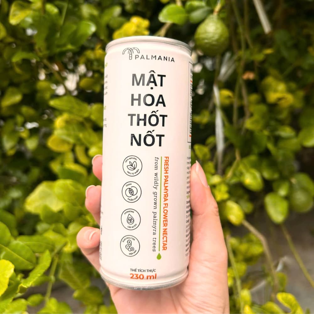 Nước uống mật hoa thốt nốt tươi Palmania là thức uống hoàn toàn tự nhiên, không pha thêm bất kỳ thành phần nào. Cây thốt nốt mọc tự nhiên phải mất ít nhất 30 năm mới có thể thu hoạch được nước hoa — mỗi lon nước là kết tinh của một quá trình dài bảo tồn thiên nhiên.